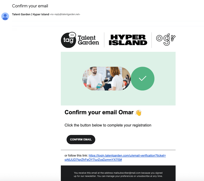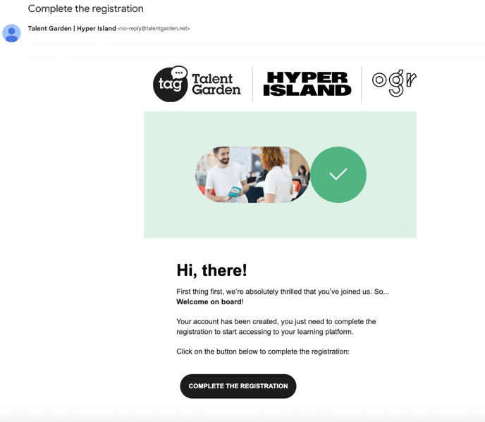Una volta che il responsabile della tua azienda (owner) ti avrà invitato a unirti all’organizzazione su Talent Garden, riceverai una mail di invito automatica all’indirizzo aziendale che hai fornito.